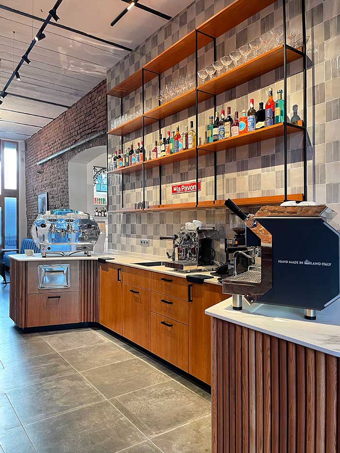 Damit an der Espressobar sowohl beraten und verkauft als auch bedient und genossen werden kann, drehen wir die Bar einfach um. Inside out. Mit diesem kleinen Kunstgriff passt plötzlich alles zusammen und wir bekommen genau, was wir brauchen.